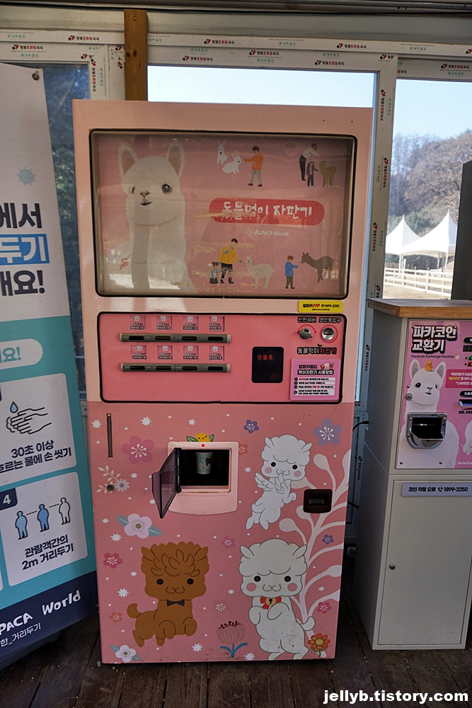이런 자판기에 코인을 넣고 알파카 사료를 뽑으면 된다.